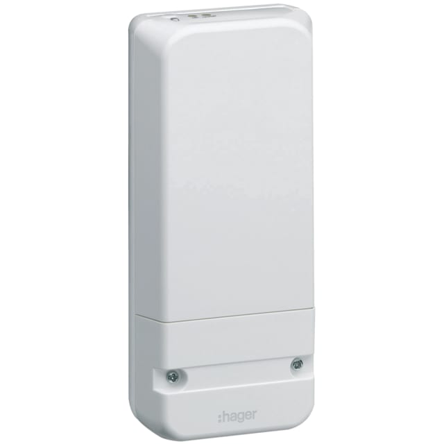 Le boîtier, en PC‑ABS de couleur blanche, mesure 130 mm de hauteur, 60 mm de largeur et 27 mm de profondeur. Ce format discret facilite l’intégration dans un tableau ou un local technique près du compteur Linky. Le choix du PC‑ABS apporte robustesse et stabilité, tandis que la finition blanche s’harmonise avec les appareillages électriques HAGER et l’environnement résidentiel.