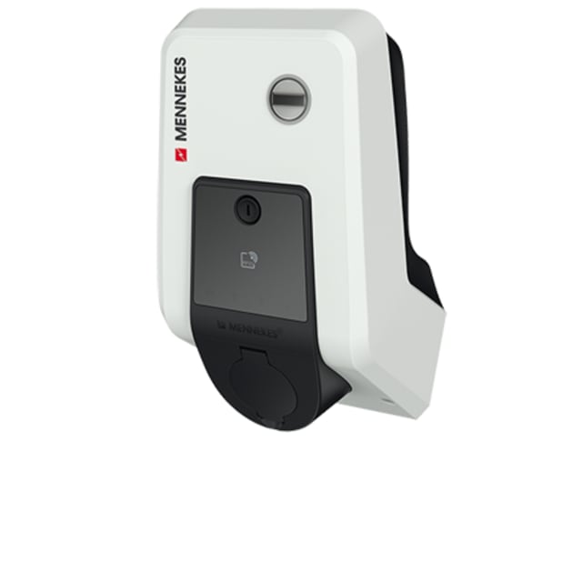 Borne murale Mennekes 11 kW (triphasé) avec prise Type 2. Activation RFID (3 cartes) ou via CPO, facturation certifiée MID via OCPP 1.6/Ethernet. Robuste IP54 IK10, idéale entreprises/parkings publics.